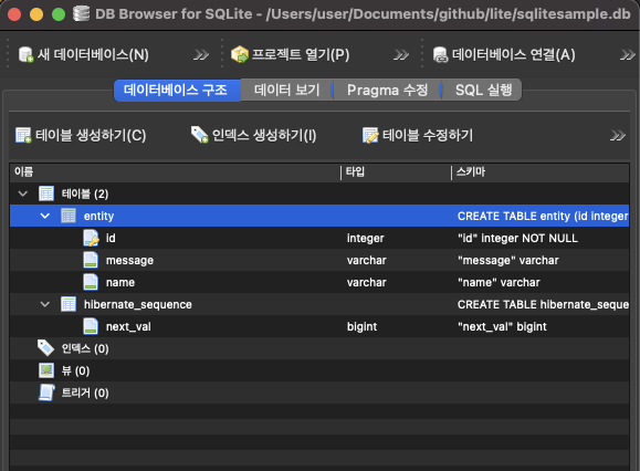 properties 파일에 위 설정덕분에 프로그램을 다시 run 하고나면 자동으로 테이블이 설정 돼 있다. DB브라우저를 설치하고 확인해보겠다.
