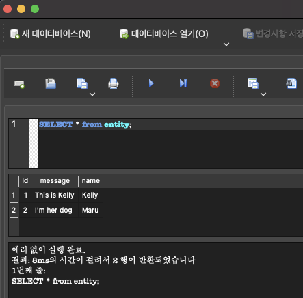 Entity Class에서 설정해준 id, name, message가 잘 들어가있는 걸 확인할 수 있다.