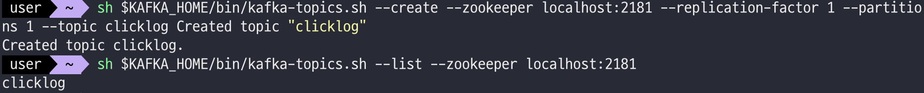 개인적으로 Flafka (Flume + Kafka)를 구현하기 위한 카프가 실행이기 때문에, Flume configuration에 카프카 토픽명이 clicklog라고 되어 있는 것을 감안해서 clicklog라는 토픽을 생성한다. 테스트니까 파티션은 1개만 생성.